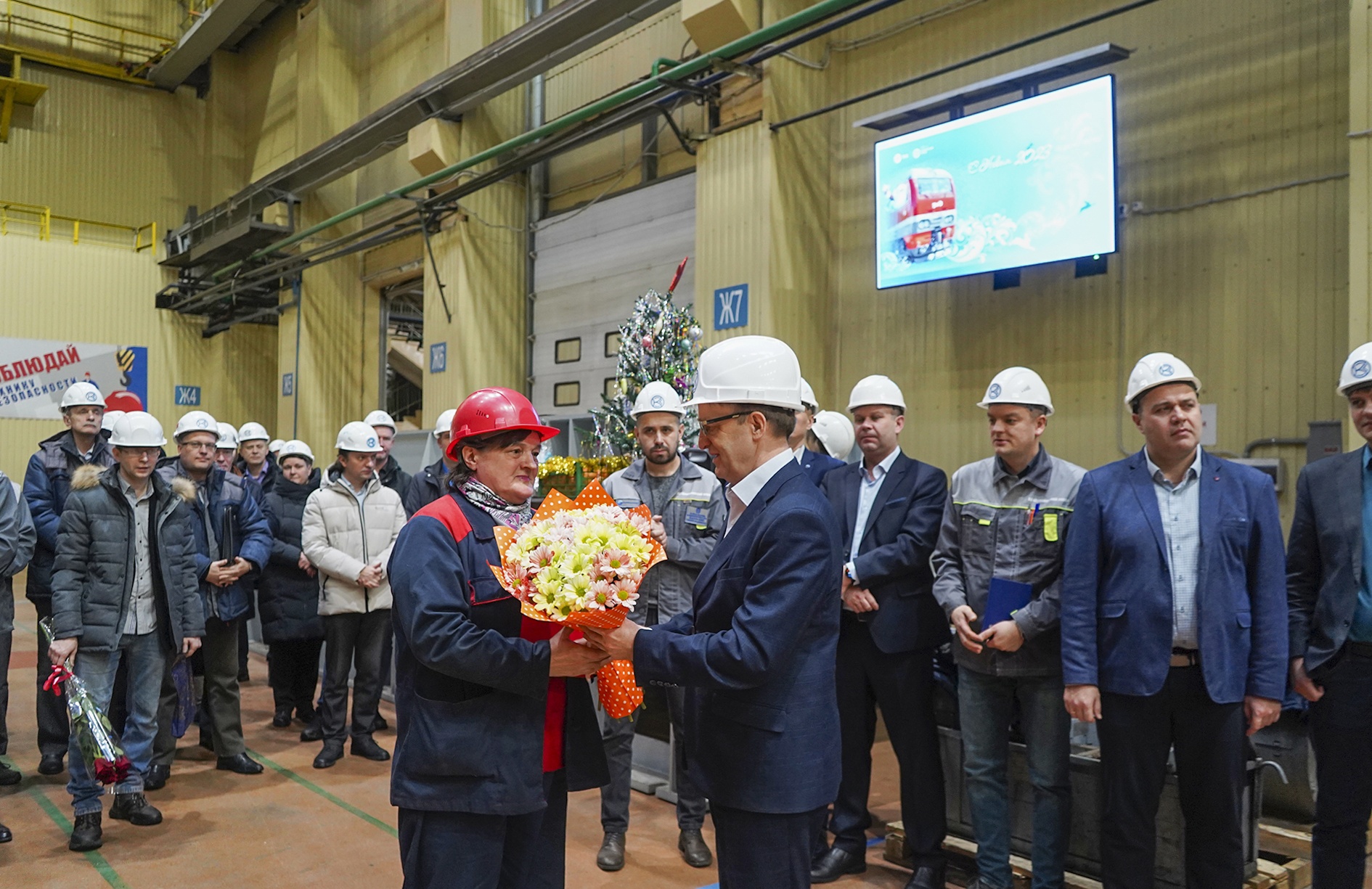 Дед Мороз и Снегурочка пожелали работникам Коломенского завода дальнейших успехов в создании надежных двигателей, пассажирских тепловозов ТЭП70БС и электровозов ЭП2К и вручили сладкие подарки коллективу механического цеха №63 – победителю конкурса на лучшее украшение своего рабочего места.